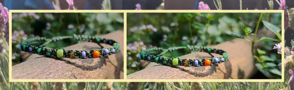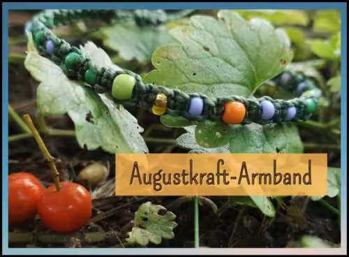 In diesem Armband bilde ich die Farben ab, die mir kürzlich an einem schönen Augusttag begegnet sind: das satte Laubgrün des nahgelegenen Waldes, das dunkle Grün vom Laub der Eberesche, das kräftiges Orange-Rot der Vogelbeeren. Dazu die lila Lavendelblüten aus den Gärten, ein helleres Apfelgrün, das Hellblau des schönen Spätsommerhimmels und ein goldener Lichtstrahl durch das Laub.